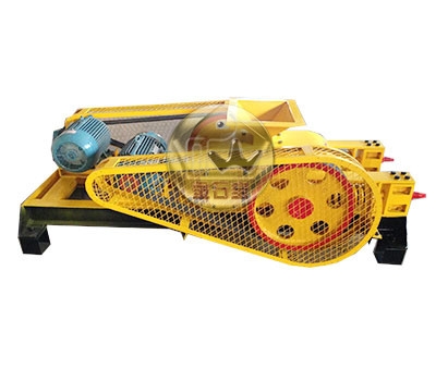 2、驱动机构:是由两个电动机,通过三角皮带传动到槽轮上拖动辊轮,按照相对方向运动旋转。在破碎物料时,物料从进料口通过辊轮,经碾压而破碎,破碎后的成品从底架下面排出。